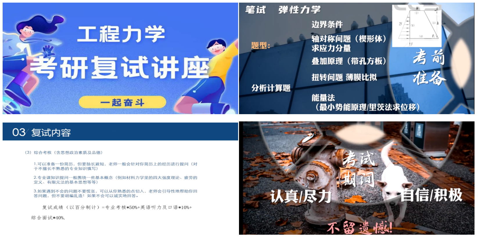 力学专场邀请到来自2024 级硕士生第一党支部的段定骁以及 2024 级硕士生第二党支部的黄馨怡两位同学作经验分享。段定骁围绕复试信息收集、重要时间节点、具体复习备考等方面进行了讲解,详细分享了研究生复试的准备过程。此外,他还在复试材料准备、沟通表达技巧方面给出了实用经验。黄馨怡从个人实际出发,分享了如何科学制定复试准备计划。她强调要将专业课复习、英语听力及口语训练、面试技巧等复习环节合理分配,做好时间管理。