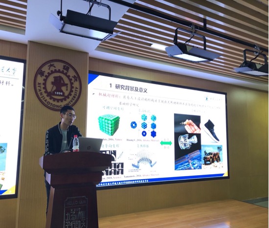 殷旭同学回顾了硕士阶段的科研经历,并总结了许多科研经验,他向同学们介绍了他的研究方向基于八面体状张拉整体的超材料钩形设计与力学性能研究,在研究中他设计了一种超材料组合拼接方案,利用阶梯轴和径向轴承释放微结构之间的扭矩传递,并对拼接后超材料做拉伸压缩试验,从而设计出了以八面体状张拉整体结构为胞元组装出具有优异力学特性的大规模机械超材料。分享过后便有研究超材料的同学与他进行了探讨与交流。
