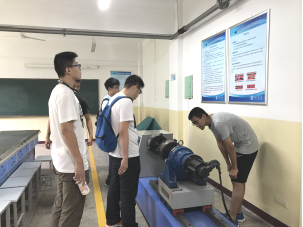 同学们共同参观力学国家级实验教学示范中心的实验室,通过刘书静老师热情而详实的讲解,同学们较为深入地了解了力学性能实验室的屏显电子万能试验机、屏显液压万能试验机和屏显扭转试验机等设备,并在老师的示范下观摩了针对不同金属材料的拉伸、压缩、弯曲及剪切等力学性能测试的实验项目。之后,徐志敏老师带领学生们参观了组合梁弯曲应力测定实验室、空气动力学实验室和水洞实验室。