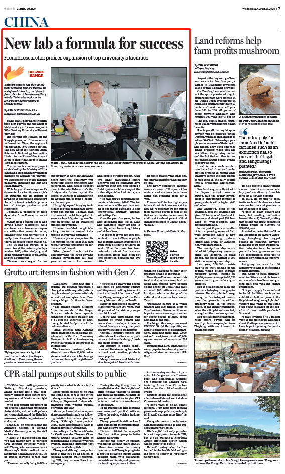 8月26日,中国日报第7版“小康路上的外国人”栏目以“New lab a formula for success”为题,报道西安交大情侣色情 外籍教授陶益壮的科研故事,现将全文转载如下: